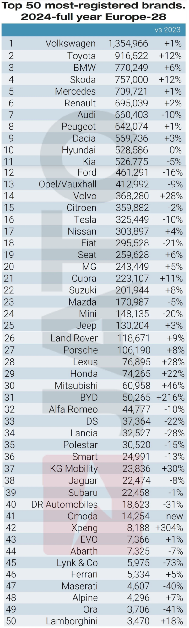 JATO Dynamics a compilé les chiffres de 28 pays européens pour établir le top 50 des modèles automobiles les plus populaires en 2024. Et en bonus, le top 50 des marques aussi !