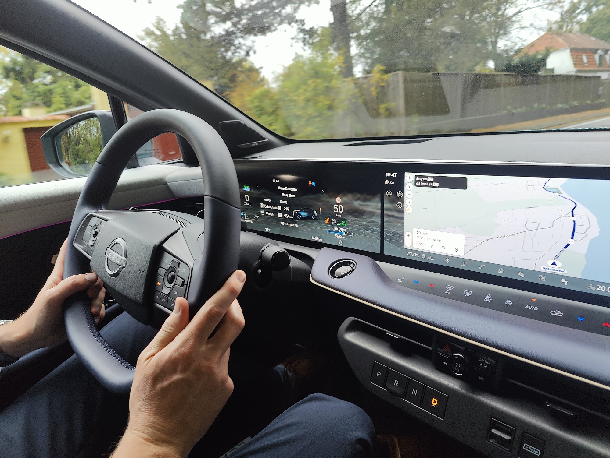 La LEAF combine des finitions premium, tissus recyclés et matériaux doux au toucher avec des plastiques plus rigides. La planche de bord est moderne et minimaliste, mais les gros boutons carrés pour P, R, N et D, situés sur la console centrale flottante attirent inévitablement l’attention. Ils remplacent le levier ou la molette traditionnels et rappellent les grosses touches des téléphones destinés aux seniors. Peu élégants sur le plan esthétique, ils sont néanmoins pratiques et faciles à utiliser, même avec des gants d’hiver.